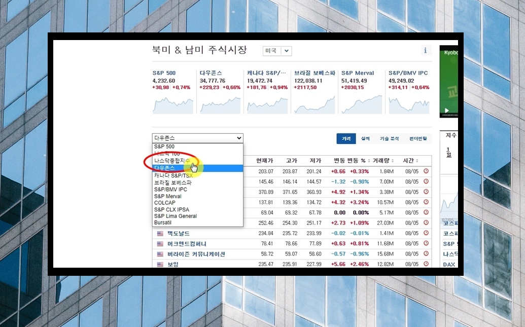 3. 북미 및 남미 주식시장에서 거래할 수 있는 개별 주식 종목이 나타났습니다. 표를 통해 간단히 시세 확인을 할 수 있도록 되어 있는데요. 일단 표에서 좌측 상단을 보면 지수 선택을 할 수 있는 셀렉트 박스가 있습니다. 여기에서 "나스닥 종합지수"를 선택해 주세요.