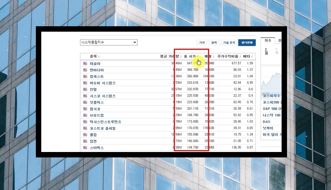 5. 각 종목에 대한 시총이 나타났습니다. 바로 "총 시가" 부분인데요. 시총은 "시가" 또는 "시가총액"이라고 말할 수 있습니다. 이 외에도 평균 거래량, 매출, 주가수익비율, 베타 확인이 가능해요. 여기에서 나스닥 시총 순위를 알아보고 싶다면 표 상단에 있는 "총 시가" 부분을 클릭하면 됩니다.