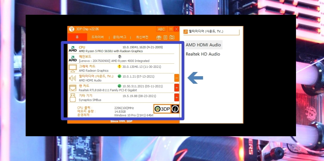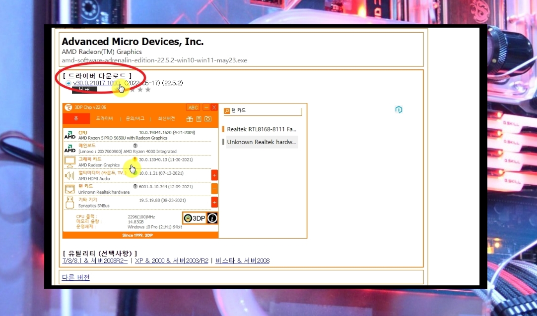 7. 3dp chip 프로그램을 실행하면 앞서 보았던 것처럼 바로 내 컴퓨터에 대한 사양 보는 것이 가능합니다 여기에서 각 하드웨어 이름을 마우스로 클릭해 보세요. 그럼 해당 하드웨어에 알맞은 드라이버 프로그램을 다운로드 받을 수 있는 웹페이지가 열립니다. 가장 맞는 버전을 추천해 주지만, 해당 버전이 본인 컴퓨터에 맞지 않는 경우를 대비하여 다른 오전에 드라이버도 제공되고 있으니 참고해 주세요.