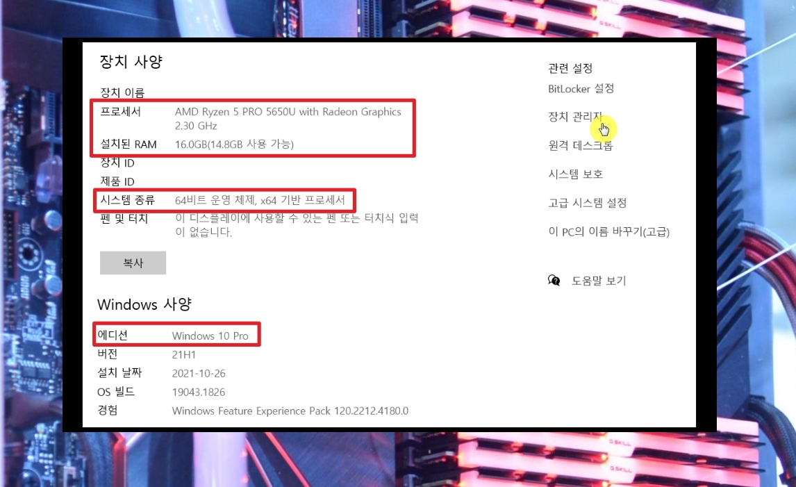 3. 시스템 창이 열리면 내 컴퓨터의 몇 가지 사양에 대해 보는 것이 가능합니다. 가장 중요한 프로세서는 CPU를 의미하고, 그 다음 램, 윈도우 운영체제에 대한 스펙 정보가 나열됩니다. 새롭게 열린 창에서 우측에 보면 관련 설정 카테고리가 나오는데 여기에서 [장치관리자]는 클릭해주세요.