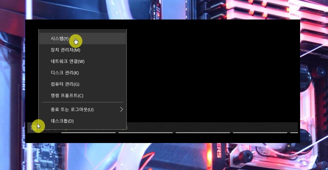2. 프로그램을 이용하기 이전에 해당 사양 정보가 맞는지 확인해 보도록 하겠습니다. 윈도우에서 바로 확인이 가능합니다. PC가 켜지면 [시작] 버튼에 마우스 우클릭을 해 주세요. 그럼 여러 가지 메뉴가 나타납니다. 여기에서 시스템을 클릭합니다.