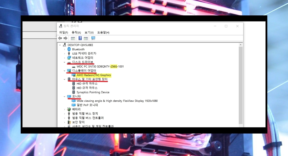 4. 장치관리자 창에서는 내 컴퓨터에 장착된 거의 모든 하드웨어에 대한 정보를 보는 것이 가능합니다. 앞서 확인한 cpu와 램을 제외한 하드디스크, 그래픽카드, 모니터, 마우스, 키워드에 대한 사양을 보는 것이 가능하죠.