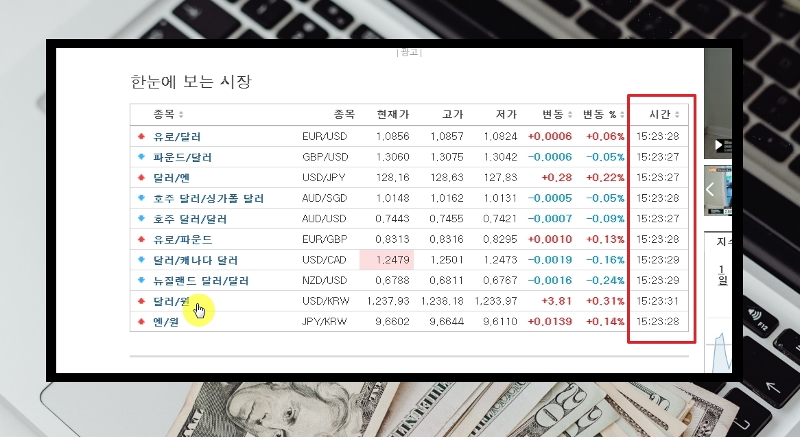 4. 새롭게 열린 페이지를 통해 여러 외환 시장의 환율에 대한 정보를 만나볼 수 있습니다. 한눈에 보는 시장이라는 표를 보면 유로, 파운드, 달러, 엔, 호주 달러 등 여러 나라의 통화에 대한 시세가 조회 되고 있습니다. 표에서 가장 우측에 있는 시간은 "업데이트 시간"을 의미합니다. 해당 시간이 흐르는 것을 통해 환율 조회가 실시간으로 진행되고 있다는 것을 알 수 있습니다. 여기에서 상세히 알아보고 싶은 통화 종목을 클릭해 보겠습니다.