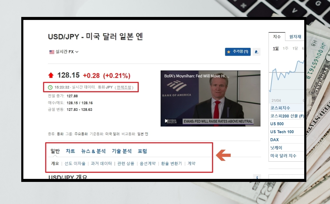 5. 저는 최근에 급상승을 하고 있는 미국 달러 일본 엔을 선택했습니다. 해당 지표가 상승하는 만큼 엔화의 가치가 하락하고 있는 것을 알 수 있습니다. 새롭게 열린 페이지를 보면 명확하게 "실시간 데이터" 표기가 되어 있습니다. 인베스팅 사이트에서는 실시간 환율 시세는 물론이고, 메뉴에 있는 것과 같이 차트, 뉴스, 분석, 포럼 등의 자료를 무상으로 제공하고 있습니다.