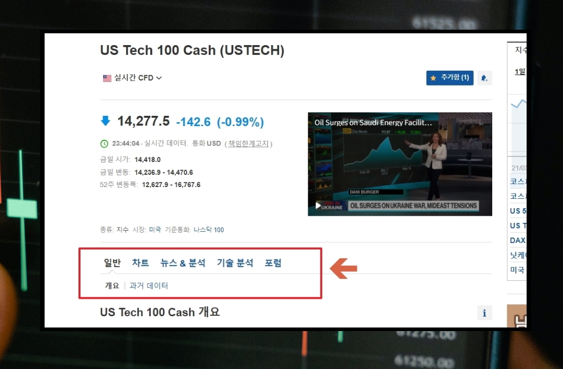 9. US Tech 100 Cash는 나스닥 선물 지수입니다. 앞서 언급한 바와 같이 요즘에는 나스닥이 전 세계 지수를 선도하는 경향이 큽니다. 그렇기 때문에 해당 지수를 잘 살펴보는 것이 좋습니다. 이곳에서 차트, 뉴스, 분석 자료 등 여러 가지를 살펴볼 수 있습니다.