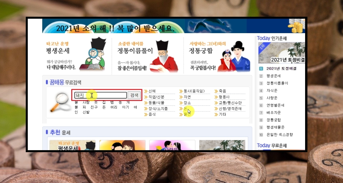 1. 제가 자주 이용하는 무료 해몽 사이트에서는 다른 운세 사이트와 다르게 로또 관련 운세 서비스를 제공하고 있습니다. 여기서 어제 꾼 꿈을 바탕으로 로또 번호를 얻어낼 수 있습니다. 당연히 무료 입니다.