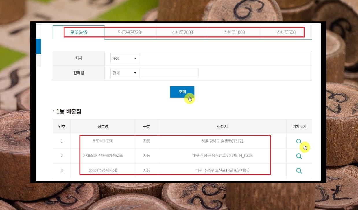 8. 로또6/45, 연금복권720+, 스피또에 대해서 회차별 1등 배출점을 쉽게 찾아볼 수 있습니다. 배출점의 상호명과 소재지가 나오기 때문에 방문하기에도 용이합니다.