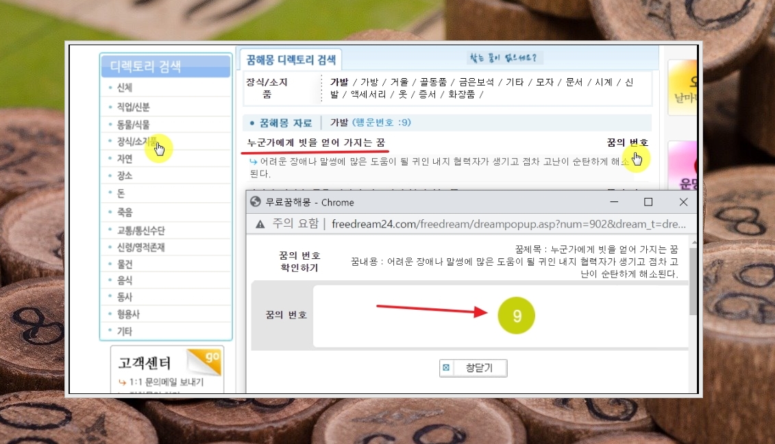 5. 좌측에 있는 디렉토리 검색을 통해 신체, 장식, 소지품, 자연, 장소 등 다양한 꿈의 소재를 선택할 수 있습니다. "누군가에게 빗을 얻어 가지는 꿈"을 선택해 보았는데요. 이로 인해 로또 꿈해몽 숫자 9번을 얻었습니다.