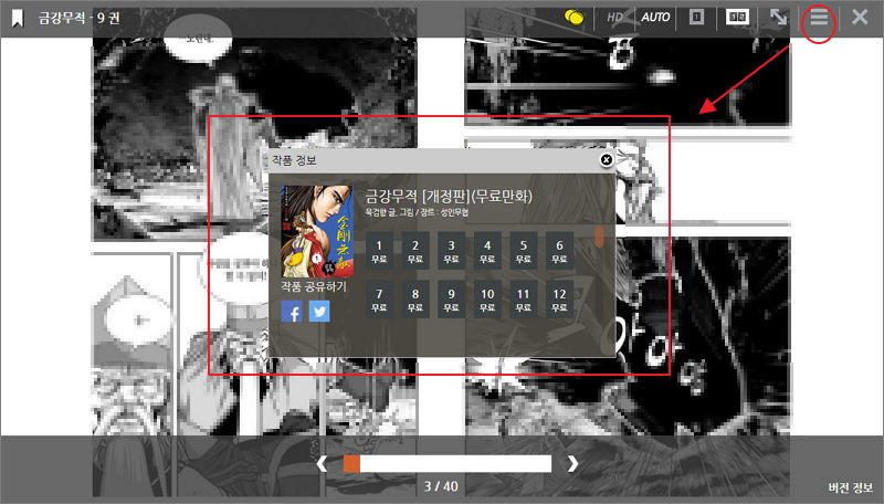 ▼ 다른 권을 보고 싶은 경우에는 메뉴에서 가장 오른쪽 2번째에 있는 버튼을 클릭하면 됩니다. 그럼 다른 권을 쉽게 선택할 수 있습니다. 무료 무협만화 카테고리에 포함된 작품이기 때문에 1권 외 다른 권들도 무료 표시가 되어 있습니다.