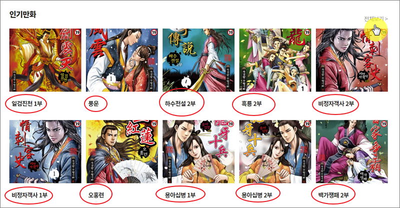 ▼ 세 번째로는 사람들이 많이 찾는 인기만화 시리즈입니다. 일검진천, 풍운, 오홍련, 비정자객사, 용아십병, 백가쟁패, 흑룡, 하수전설 등 여러 인기 작품을 한 눈에 살펴볼 수 있습니다.