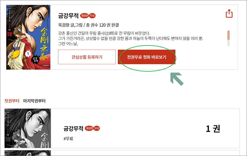 ▼ 무료로 묵검향 무협만화보기 위해서는 무료 작품 위주로 선택하면 됩니다. 작품을 선택하면 해당 작품에 대한 줄거리와 함께 감상 버튼이 나타납니다. 전권무료 첫화 바로보기 버튼에서 알 수 있듯이 전권 무료 감상이 가능합니다.