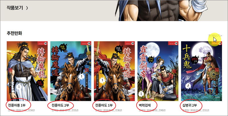 ▼ 이곳에서 제공하는 무협만화는 크게 3가지로 나뉩니다. 첫 번째로는 추천 만화입니다. 전륜마룡, 전륜마도, 벽력검제, 십병귀 등 높은 수준의 무협 작품을 추천 받을 수 있습니다. 전체보기 버튼을 클릭하면 더 많은 작품이 나타납니다.