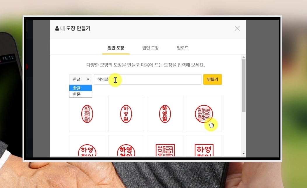 1. 먼저 맛보기로 어떤 식으로 전자 도장을 제작하는지 보여드리겠습니다. 방법은 간단합니다. 한글이나 영문으로 된 성명을 적고, [만들기] 버튼을 누르면 됩니다. 그럼 여러 가지 이미지가 자동으로 만들어지는데, 여기에서 마음에 드는 것을 하나 선택하면 됩니다.