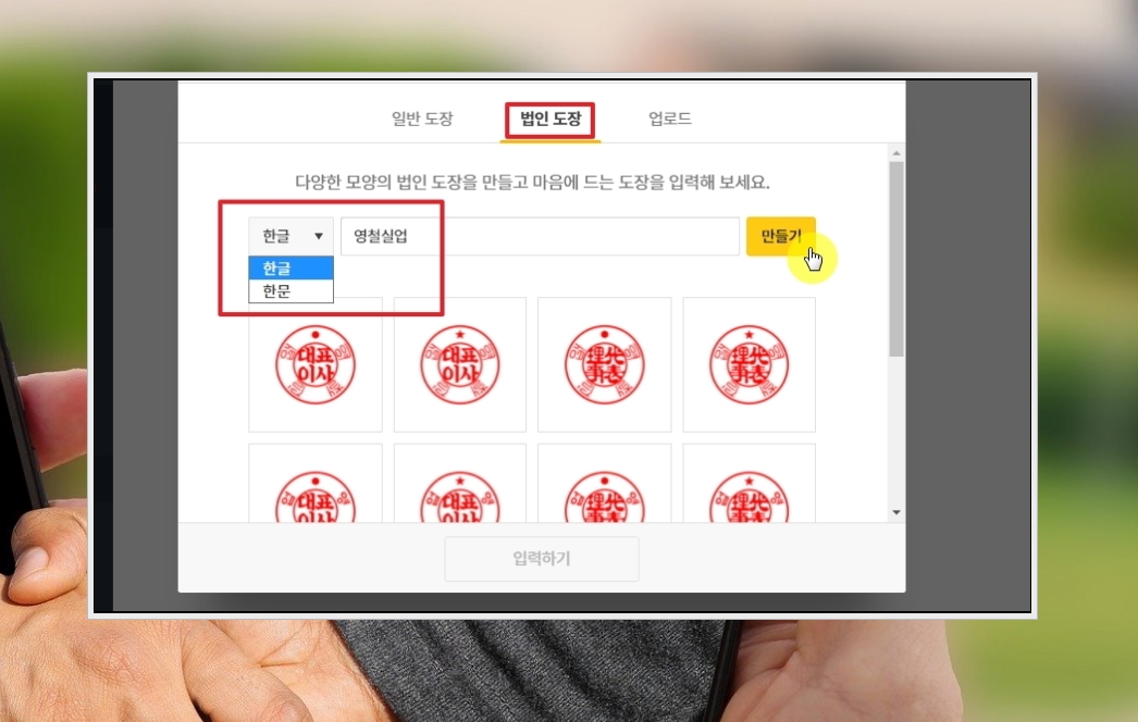 6. 전자 계약에 사용할 수 있는 법인용 버전도 만들 수 있습니다. 회사명을 입력한 후 [만들기] 버튼을 클릭하면 됩니다. 한문과 한글 2가지 방식으로 되어 있는 여러 도장 이미지가 나타납니다.