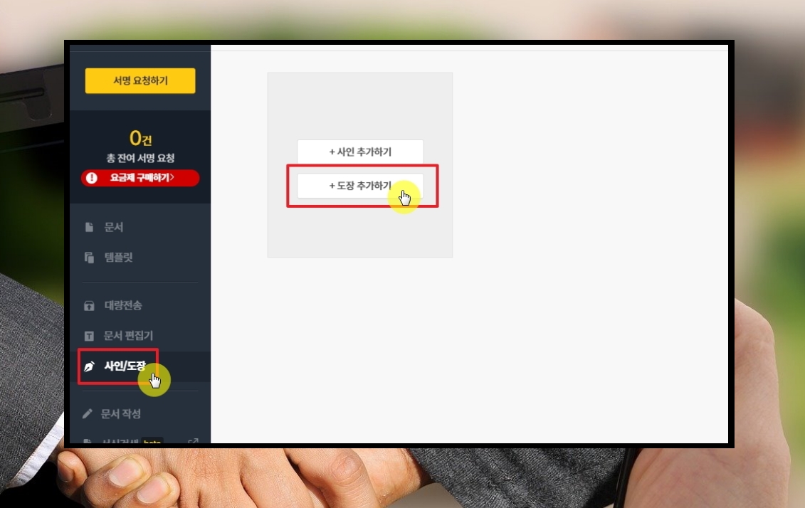 4. 홈페이지에서 로그인을 하게 되면 위와 같은 화면이 나타납니다. 여기에서 좌측에 보면 여러 메뉴가 보일 겁니다. 문서, 템플릿, 대량전송, 문서 편집기 등이 있습니다. 중간 쯤에 보이는 [사인 / 도장]을 클릭합니다. 그럼 화면 중앙에 [추가하기] 버튼이 나타납니다. 클릭해 주세요.