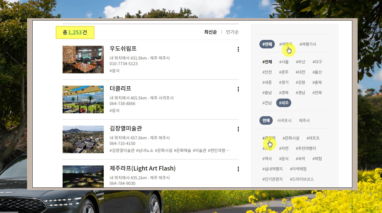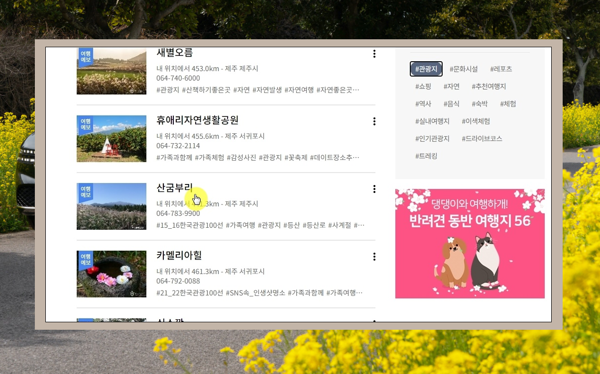 새롭게 열린 페이지를 통해 제주도 여행에 관련된 여행지와 여행기사를 살펴볼 수 있습니다.