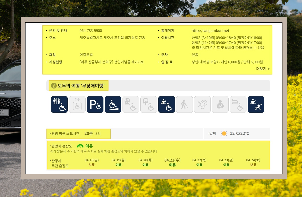 제주도를 가고 싶지만, 어떤 여행지를 방문해야 할지 결정하기 어려울 때가 있죠. 이럴 때 351개의 관광지를 추천 받을 수 있는 서비스를 활용해 보세요. 이를 통해 다양한 사진, 평균 소요시간, 휴일 정보 등 필요한 정보를 상세하게 제공 받을 수 있습니다.