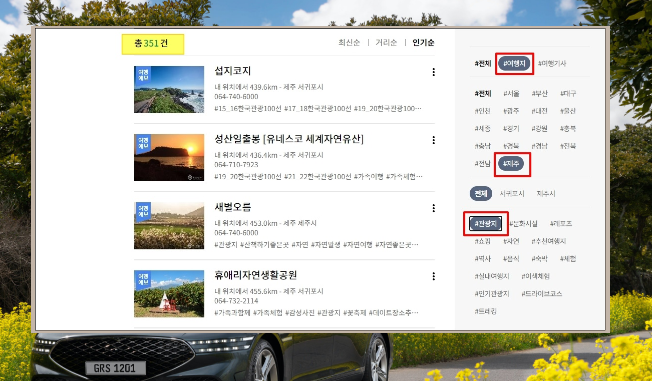 앞서 언급한 바와 같이 이렇게 351건의 제주도 관광지를 모두 살펴볼 수 있는 서비스가 있습니다.