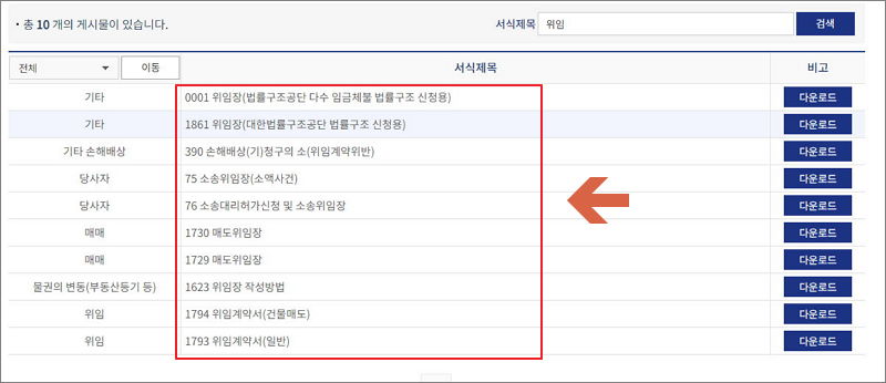 총 10개의 양식을 나타났습니다. 법률구조 신청용, 손해배상 청구용, 소액사건 소송용, 매도 및 매수 위임장, 건물 매도 및 일반 위임 계약서 등이 있음을 알 수 있습니다. 다운로드 버튼을 클릭하면 위임장 양식을 쉽게 다운로드 받을 수 있습니다.