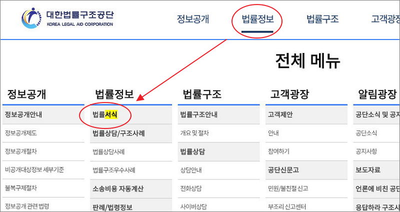 대한법률구조공단 사이트에서 제공하는 법률 서식을 다운 받아보겠습니다. 메뉴에서 법률정보를 클릭한 후 첫 번째에 위치한 법률서식을 클릭해 주시길 바랍니다.