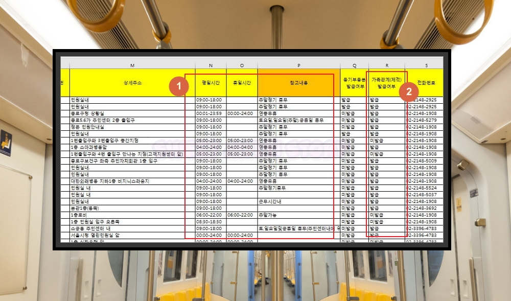 2. 엑셀 문서를 통해 가족관계증명서 무인발급기 위치를 알아볼 때 주의하실 점이 있어요. 일부 기기의 경우에는 가족관계(제적)에 대한 발급이 되지 않아요. 그리고 해당 기기를 이용할 수 있는 시간이 정해져 있어요. 특정 날짜의 경우 휴무로 지정이 되어 기기 사용할 수 없기도 하고요.