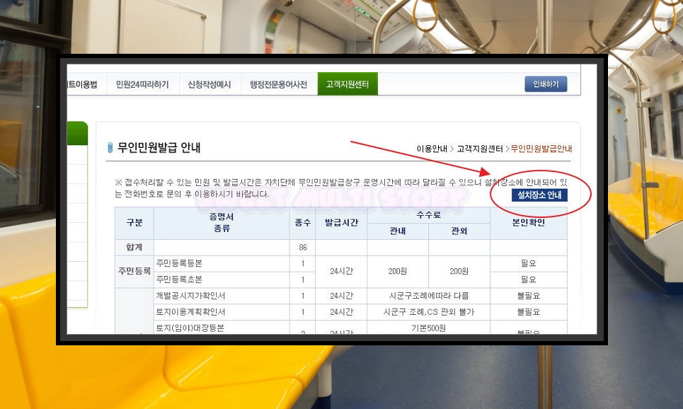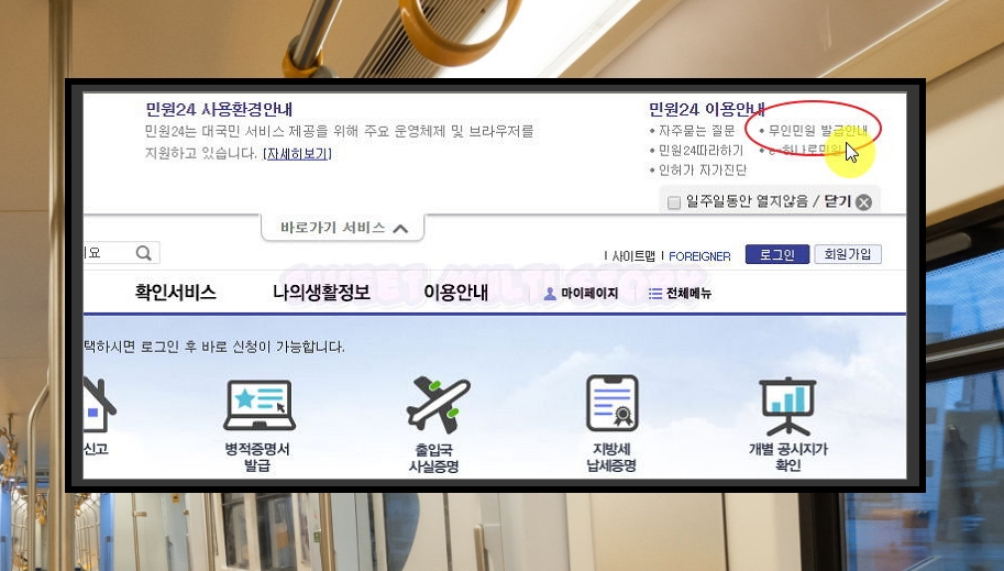 4. 시간이 흐름에 따라 무인발급기에 대한 정보가 달라질 수 있어요. 위치가 변경될 수도 있고, 기존에 있던 발급기가 없어지는 경우도 있을 수 있겠죠. 이럴 때를 대비하여 직접 위치에 대한 문서를 다운 받는 방법을 알려드릴게요. 정부민원포털인 민원24 사이트에 접속해주세요.