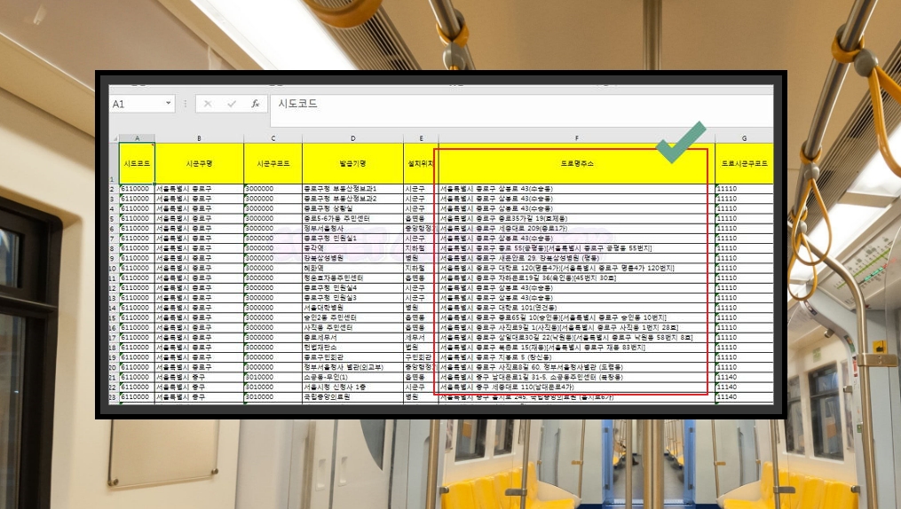 1. 최근에 공공기관 사이트에 다운 받은 무인발급기 관련 엑셀 문서에요. 해당 문서를 통해 각 지역에 있는 무인발급기의 위치를 확인할 수 있어요. 위치를 정확하게 알 수 있는 도로명 주소도 표시되어 있어서 쉽게 찾을 수 있어요.