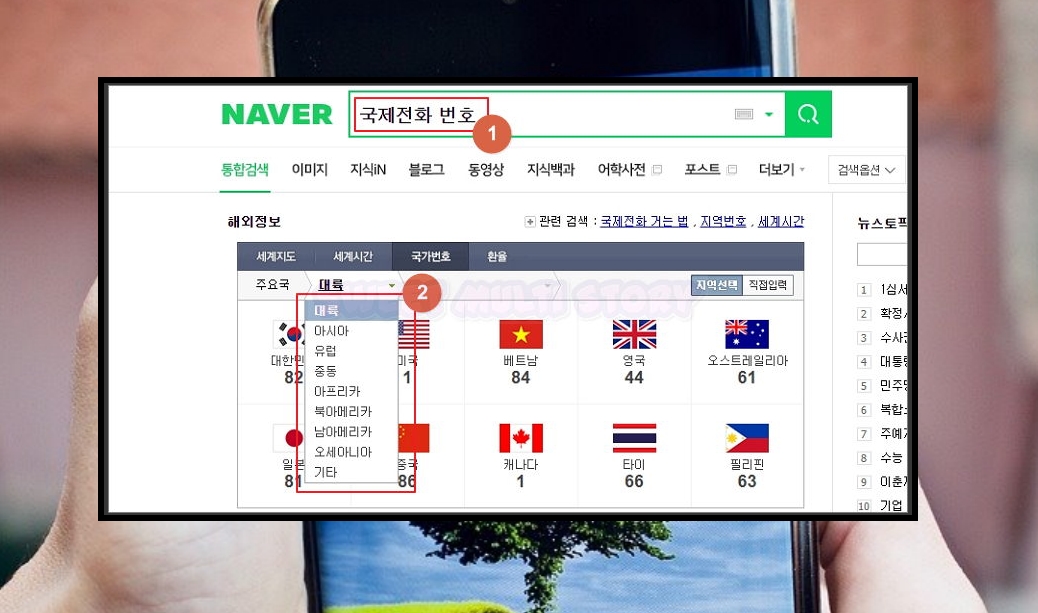 2. 간단한 검색을 통해 쉽게 해당 숫자를 찾을 수 있어요. '국제전화 번호'를 검색하면 바로 나오는데요. 주요국이 아닌 다른 나라로 국제전화를 걸 때 필요한 코드를 알고 싶다면 대륙을 클릭해 보세요. 그럼 아시아, 유럽, 중동, 아프리카, 남아메리카, 오세아니아 등에 있는 나라의 국가번호를 확인할 수 있어요.