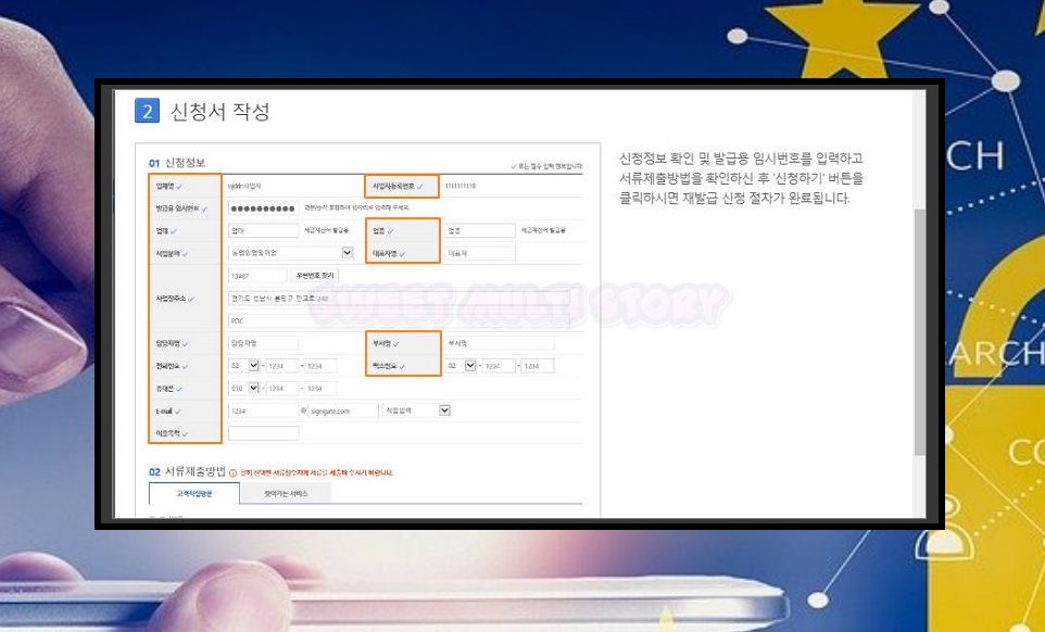 e. 신청서 작성 방법은 간단해요. 양식에 있는 빈 칸을 채워 넣기만 돼요. 신청번호와 발급용 임시번호가 필요한데요. 처음 공인인증서 발급을 받을 때 입력한 이메일을 확인해 보세요. 그 밖에 전화번호, 휴대폰 번호, 이용목적, 팩스번호 등의 개인 정보를 입력하면 신청 절차가 완료가 돼요.