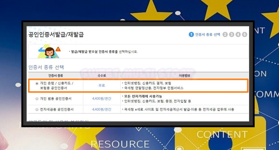 d. 일반적으로 많이 사용하는 것은 은행용이에요. 모든 전자거래에 사용할 수 있지만, 수수료가 발생하는 범용 공인인증서도 있어요. 전자세금 업무 전용도 있는데요. 범용과 비용은 동일해요. 종류를 선택한 후 안내에 따라 재발급 신청을 하시면 돼요.