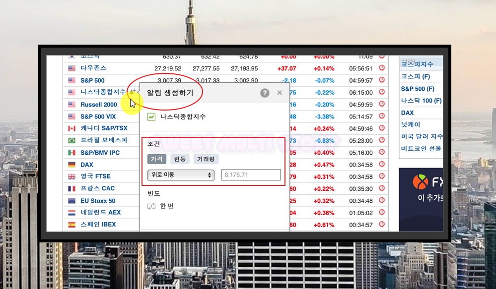 8. 인베스팅에는 알림 기능이 있는데요. 나스닥 종합지수의 가격이 어느 정도 되었을 때 알람을 울리게 할 수 있습니다. 금액 변동이나 가격이 일정 수준에 도달했을 때에 대한 알람 설정도 가능해요.