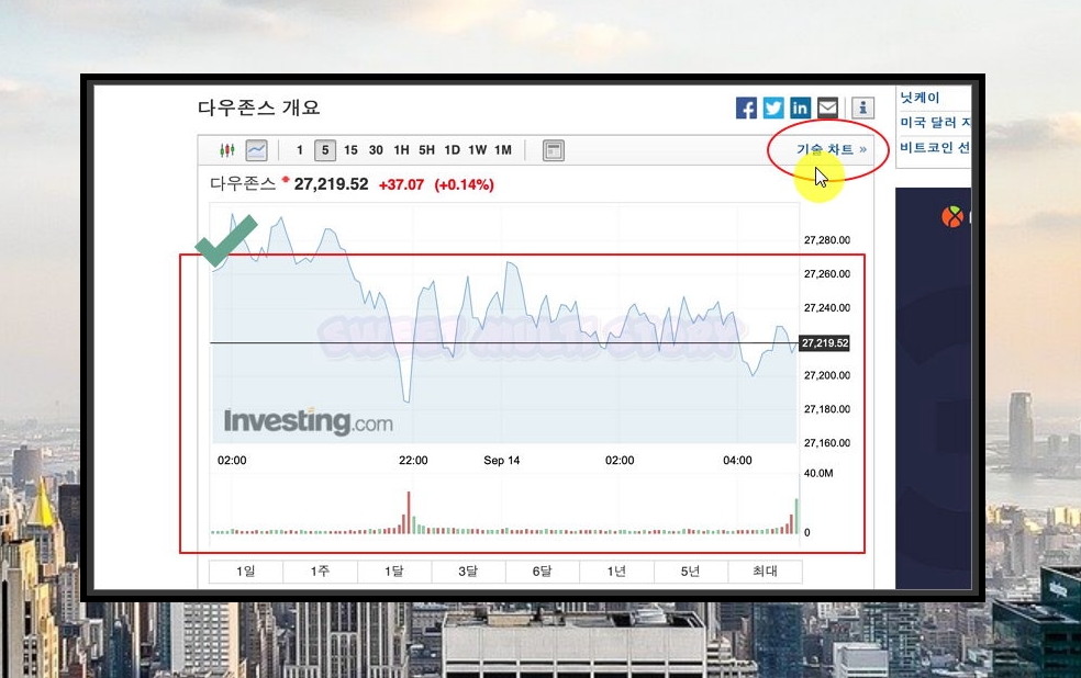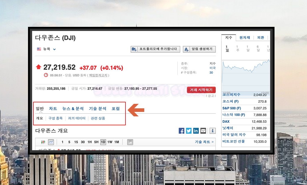3. 다우존스 지수는 미국의 증권거래소에 상장된 여러 주식 종목들로 구성이 됩니다. 미국증시 흐름을 파악하고 싶을 때 참고하면 좋은 지표인데요. 인베스팅에서는 오늘의 실시간 차트, 뉴스, 분석, 포럼 등 영양가 있는 정보를 확인하실 수 있습니다.