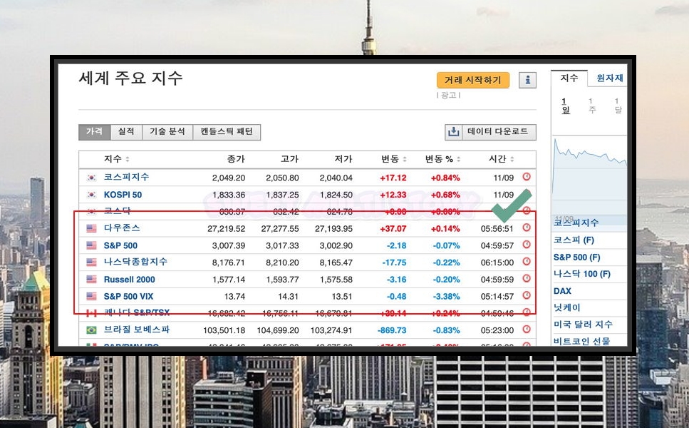 2. 오늘의 미국증시를 확인하는 방법은 간단합니다. 메뉴에서 시작 ▷ 지수 ▷ 세계 주요 지수 ▷ 다우존스를 순서대로 클릭해 주세요. 오늘의 미국증시는 다우존스 외에도 S&P 500, 나스닥 100을 통해 파악이 가능합니다.
