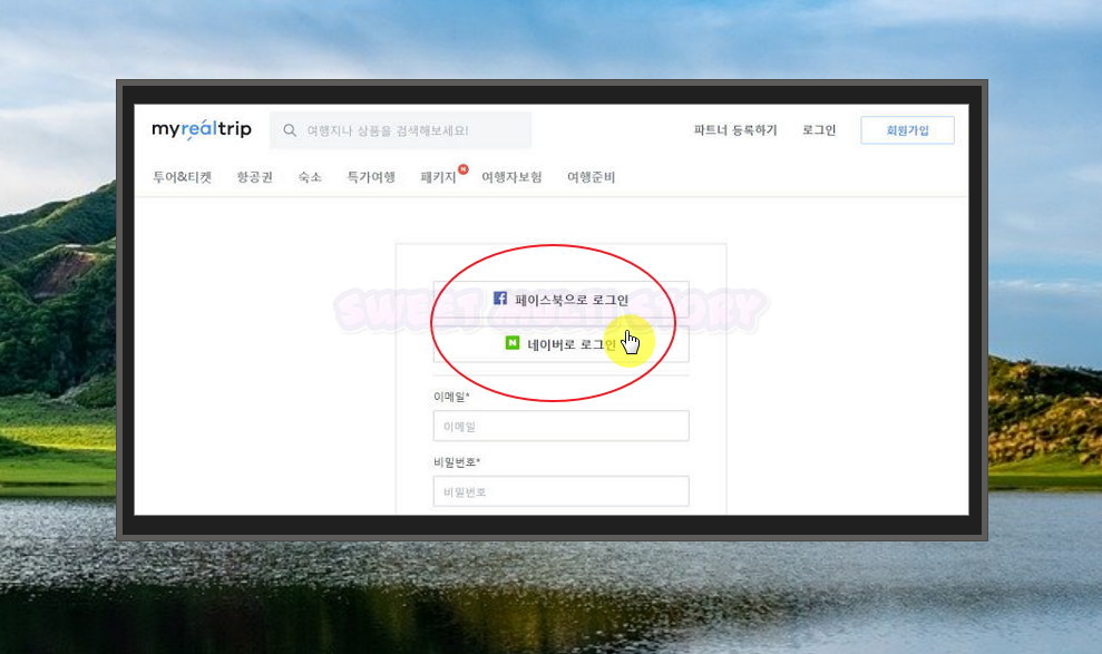 9. 예약하기 버튼을 누르면 땡처리 항공권 예매를 진행하게 되는데요. 마이리얼트립의 경우에는 로그인을 해야 티켓 예약을 할 수 있습니다. 페이스북과 네이버 아이디가 있으면 단숨에 가입할 수 있으니 참고해 주세요.