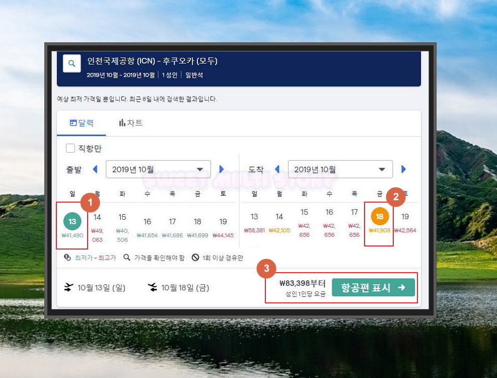 4. 비행기로 가고자 하는 지역을 선택하면 가격 표시가 되어 있는 달력이 나타납니다. 여기 나타나는 시세는 그날의 최저가 항공권 가격을 의미해요. 녹색으로 된 가격표시는 최저가를 의미하고, 빨간색은 최고가를 의미합니다.