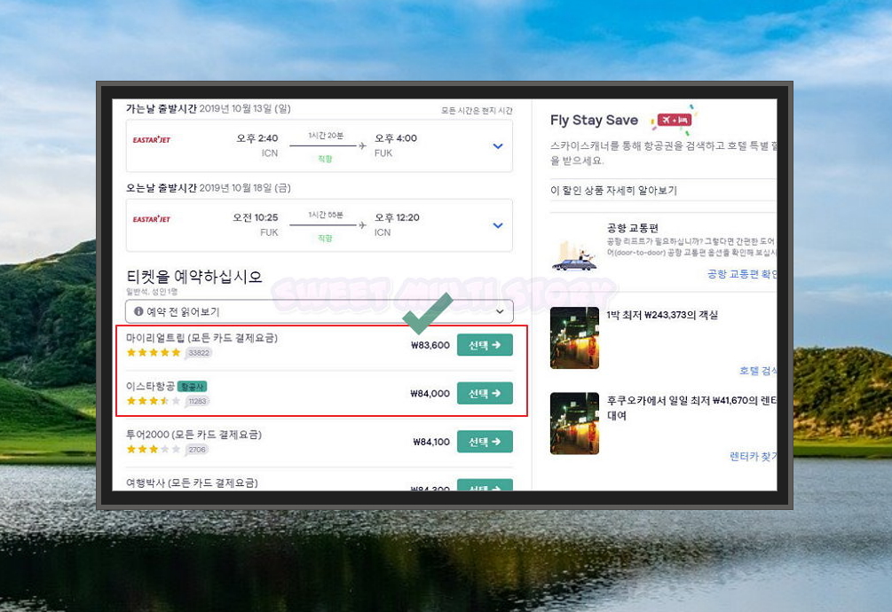 7. 원하는 일본 땡처리 항공권을 찾았다면 선택 버튼을 눌러 티켓 예매를 진행할 수 있습니다. 가는날과 오는날의 출발시간을 확인하신 후 티켓 예약을 진행할 여행사를 선택해 주세요. 여행사마다 예약 금액이 차이가 날 수 있습니다. 가급적 별점이 높고, 저렴한 곳을 선택하시면 돼요.