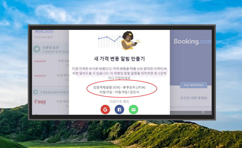 6. 새 가격 변동 알림 서비스를 통해 가격 변동이 있을 때 알림을 받을 수 있는데요. 스카이스캐너에 로그인을 해야 이용할 수 있는 기능입니다. 구글, 페이스북 등의 아이디가 있으면 좀 더 쉽게 이용할 수 있어요.