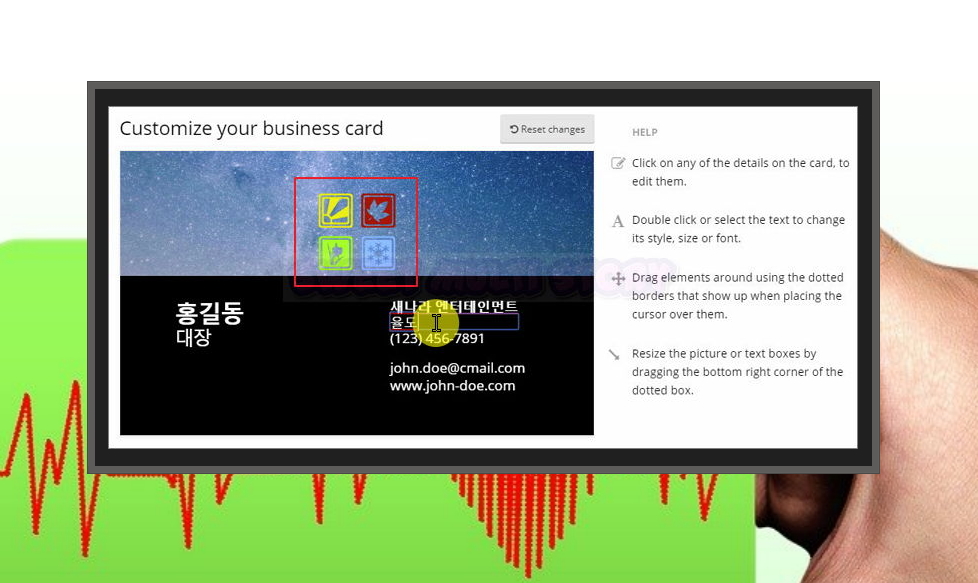 3. 선택한 샘플을 가지고, 명함을 제작할 수도 있어요. 로고 이미지 파일을 갖고 있다면, [upload your logo] 버튼을 눌러 로고를 삽입할 수 있고요. 명함에 적힌 문구를 마우스로 클릭하면 내용을 변경할 수 있어요. 영어로 되어 있는 해외 사이트이지만, 한글 입력이 가능해요.