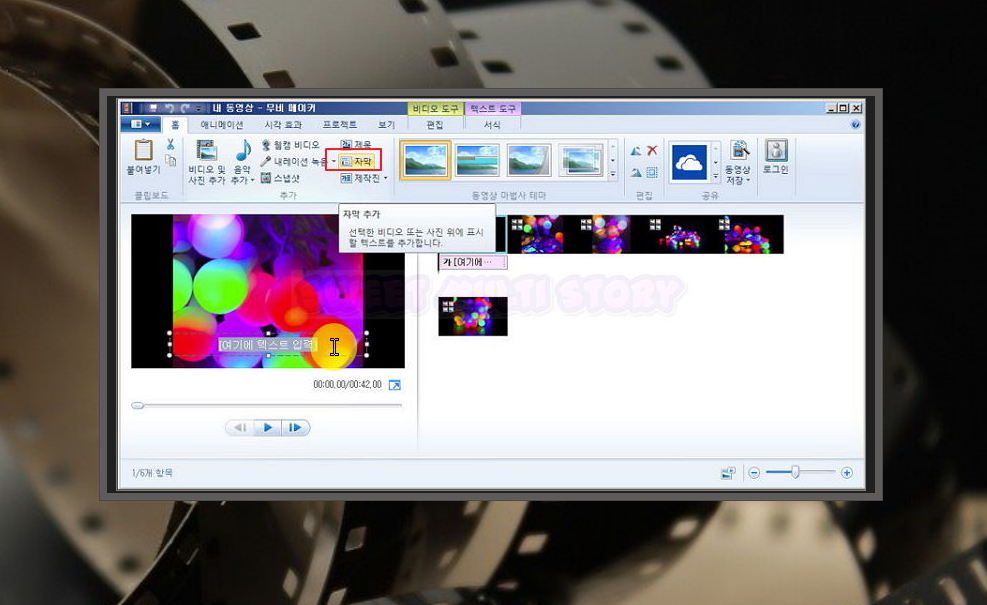 재미있는 동영상 만들기를 위해서는 자막 넣기는 필수에요. 홈 탭에 있는 자막을 클릭하면 미리보기 화면을 통해 텍스트를 넣을 수 있는데요. 자막의 글꼴, 크기 변경도 가능합니다.