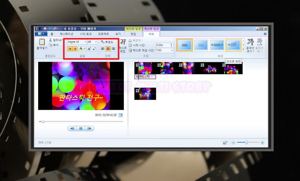 자막을 작성한 이후 메뉴에 있는 텍스트 도구를 클릭해 보세요. 그럼 효과 관련 메뉴가 보이실 거에요. 자막이 나타날 때 회전을 시키거나 늘리는 효과를 추가할 수 있습니다. 윈도우에 기본으로 설치되어 있는 프로그램이지만, 필수적으로 있어야 하는 기능은 모두 갖추고 있어요.