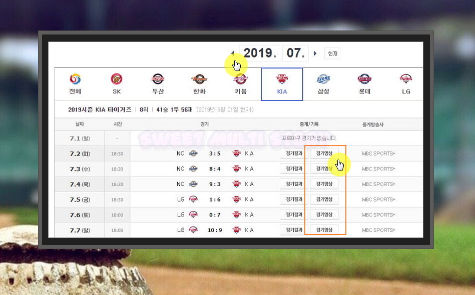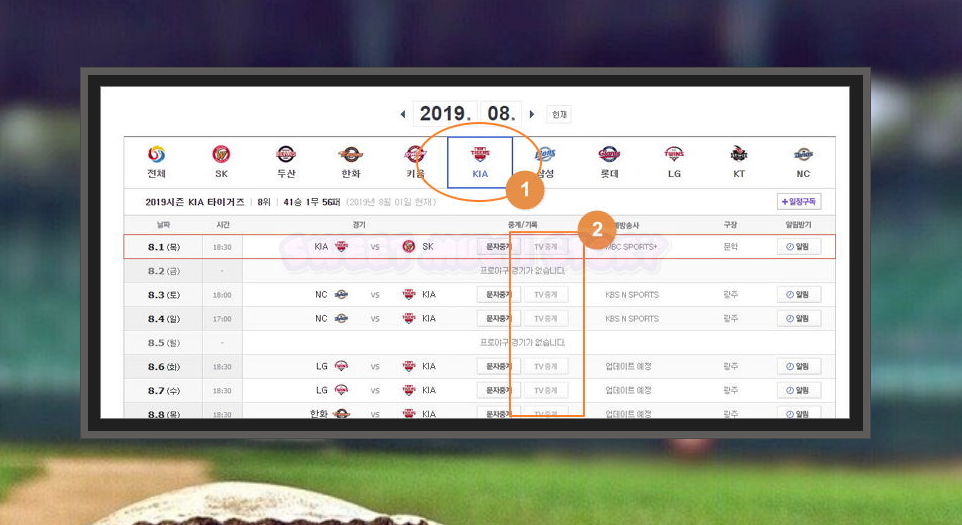 4. KBO 리그 섹션 아래에는 월별 경기 일정이 나타나요. 상단에 프로 야구단을 선택할 수 있게 되어 있는데요. sk, 두산, 한화, 키움, 삼성, 롯데, LG, KT, NC 중에서 기아 타이거즈를 클릭해보세요. 이번 2019 시즌에 기아 타이거즈는 현재까지 8위로 41승 1무 56패를 기록하고 있네요. 바로 아래에는 이번 달에 진행될 경기 일정이 나타나요. 야구 중계 부분을 보시면 TV 중계 버튼이 있는데요. 해당 버튼을 보면 경기 방송보기 가능해요.