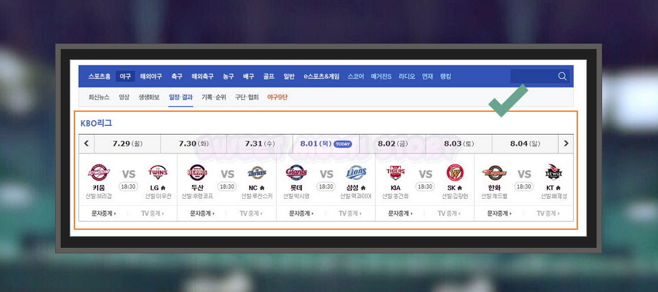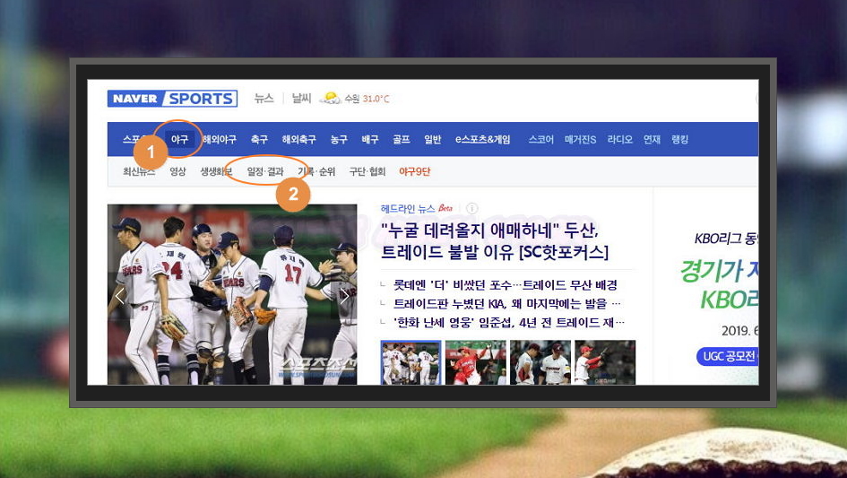 1. 현재 실시간으로 중계 되고 있는 경기는 물론이고, 이전에 치루어진 야구 경기를 쉽게 볼 수 있어요. 네이버 스포츠 사이트를 이용하면 되는데요. 기아 타이거즈의 경기 일정이나 관련 정보를 얻기에도 정말 좋은 곳입니다.