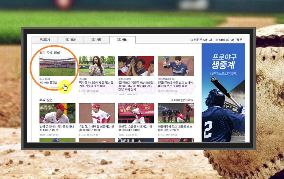 6. 해당 버튼을 클릭하면 여러 야구 영상이 나타나는데요. 처음부터 끝까지 기아 타이거즈의 경기를 보고 싶다면 풀영상을 클릭하면 됩니다. 하이라이트, 프리뷰, 주요장면, 베스트 플레이어 등 볼거리가 많사오니 함께 이용해 보세요.