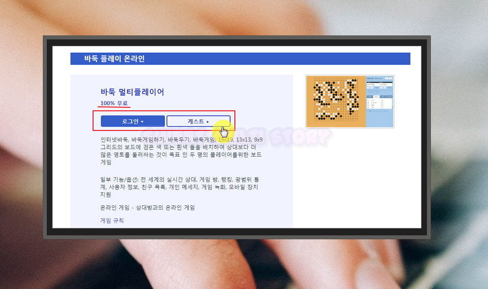 3. 온라인으로 무료 바둑 게임하기 진행을 해보도록 할게요. 이전 페이지에서 바둑 플레이 온라인을 클릭했어요. 100% 무료라고 표시가 나오네요. 자신의 전적을 관리하고 싶으면 회원가입을 한 후 로그인을 해주세요. 전적 관리가 필요 없는 분들은 게스트 버튼을 선택하면 돼요.