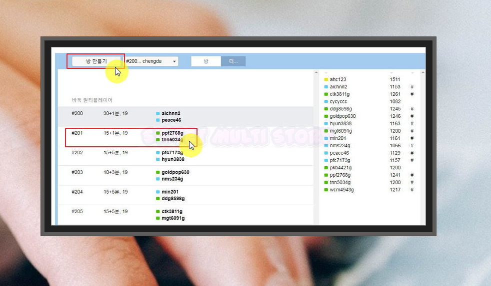 6. 설정을 마친 후에 사람들을 초대할 수 있어요. 같이 게임을 하고 싶은 사람을 초대해 보세요. 마음에 들지 않는 사람은 강퇴 버튼을 눌러주세요. 그럼 방에서 내보낼 수 있죠.