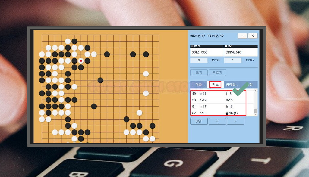 7. 게임이 진행 중인 방에 접속해 보았어요. 실시간으로 진행되고 있는 바둑 경기를 관전할 수 있는데요. 기보탭을 클릭하면 지금까지 어떻게 두었는지 확인이 가능해요.