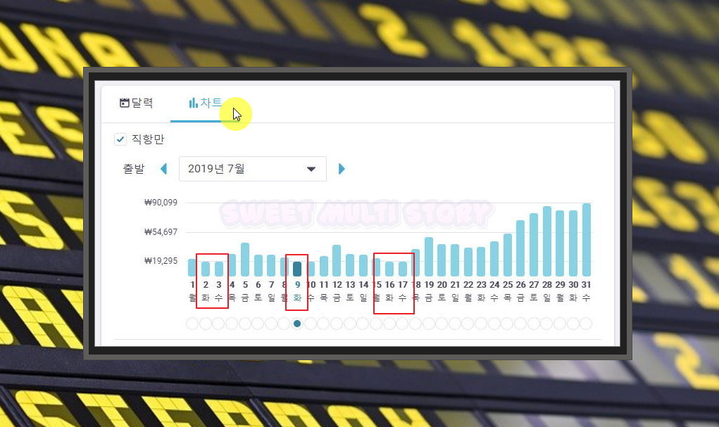 4. 달력 형식으로 보는 것이 불편하다면 차트를 이용해 구입하는 방법을 알려드릴게요. 가장 작은 막대그래프를 선택하시면 돼요. 제가 보기에는 2일과 3일, 9일, 17일에 출발하는 제주도 항공권의 가격이 가장 저렴하네요.