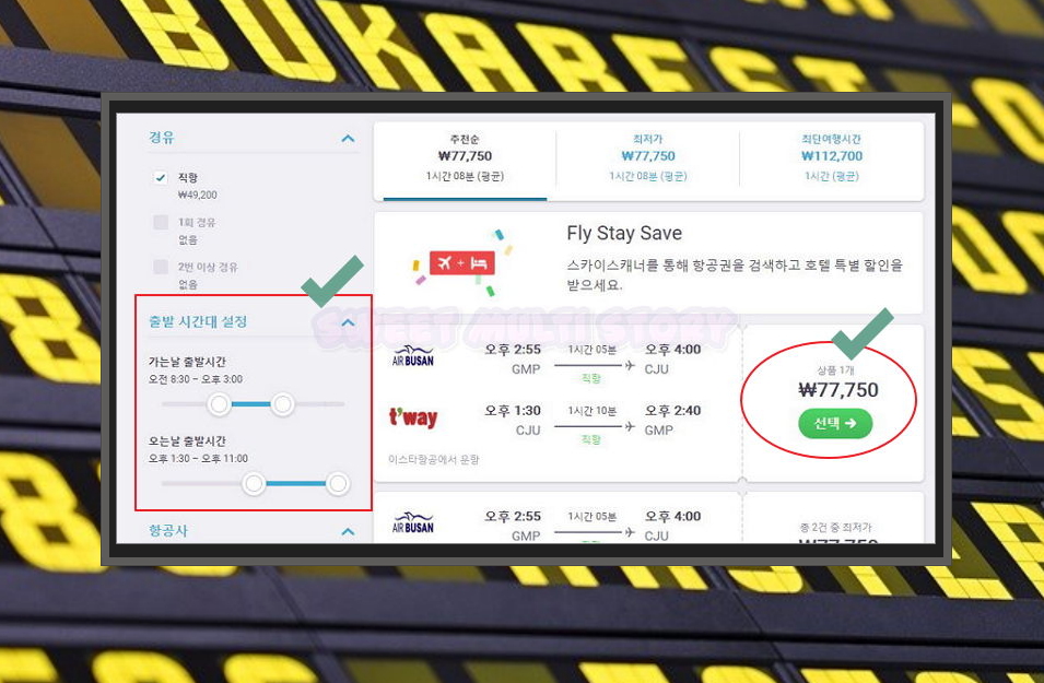 8. 방금 찾은 제주도행 티켓을 예약하고 싶다면 선택 버튼을 누르면 되는데요. 새롭게 열린 페이지에서 여행사를 선택해 주세요. 낮은 금액을 제시한 업체를 선택하시면 돼요.