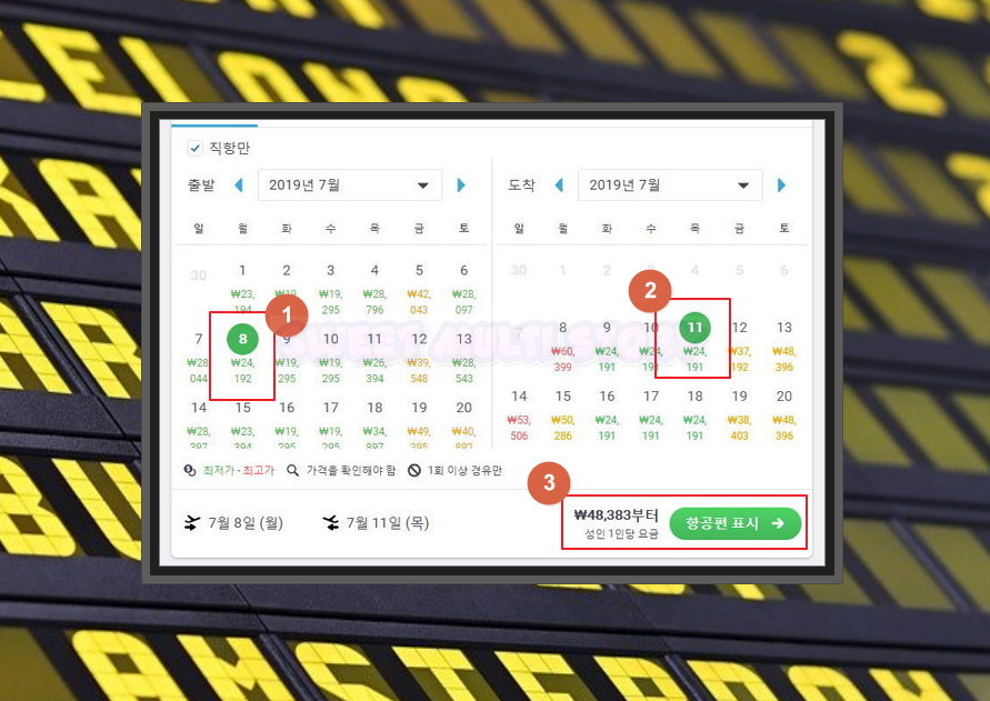 3. 결과를 보아하니 현재 기준으로 2019년 7월 달에 제주도 항공권을 구입하는 경우에 항공료를 최대한 아낄 수 있겠네요. 달력에 적힌 금액은 그 날에 가장 싼 티켓의 가격을 의미하는데요. 출발하는 날과 도착하는 날을 선택해 주세요. 제 경우에는 왕복 제주도 항공권의 가격이 48,383원 밖에 되지 않네요.