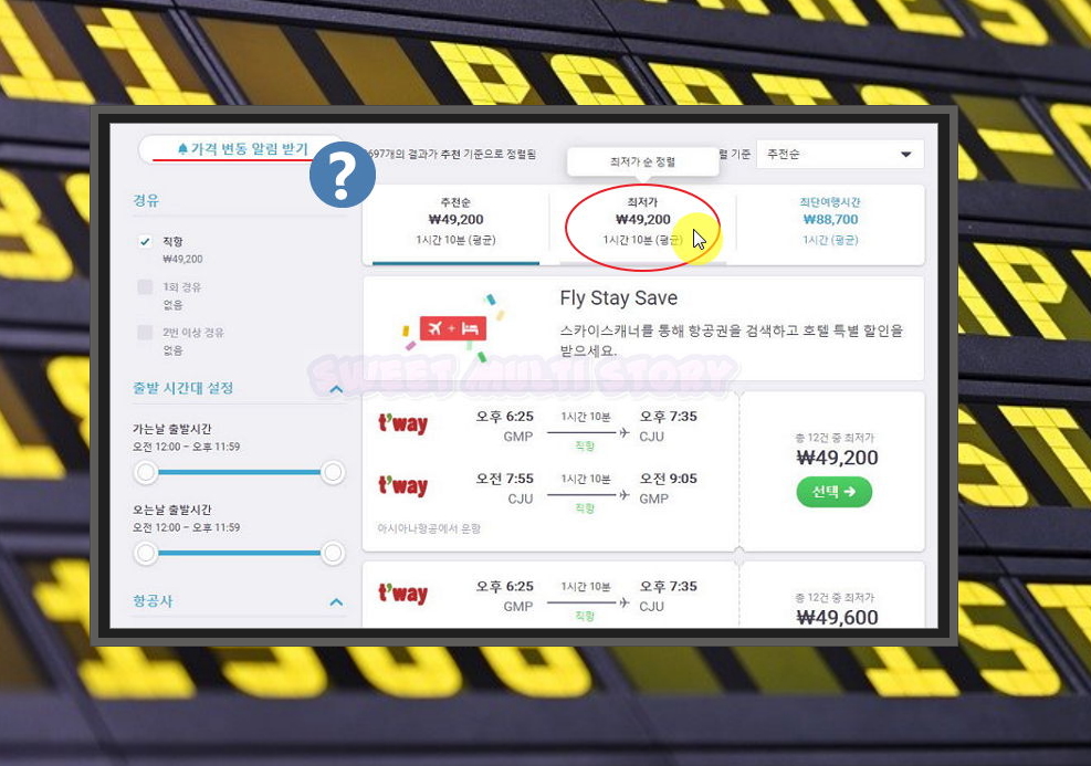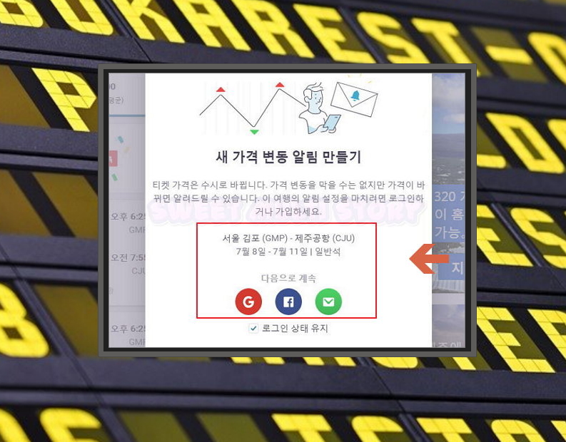 7. 이쯤에서 한 단계 업그레이드 된 제주도 항공권 싸게 구입하는 방법을 알려드릴게요. 바로 '새 가격 변동 알림 만들기' 기능을 이용하는 거에요. 그럼 지금 찾았던 티켓이 더 싸게 나왔을 때 알려줘요.